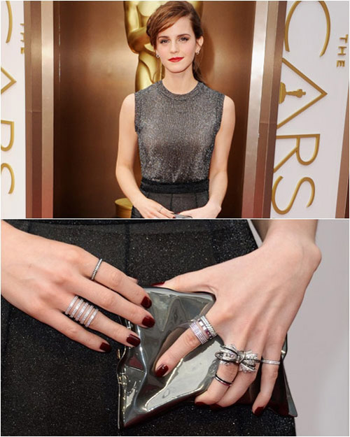 Emma watson tới lễ trao giải Oscar với chiếc nhẫn lạ mắt kết hợp cùng nhiều nhẫn trơn khác tạo ra hiệu ứng ấn tượng